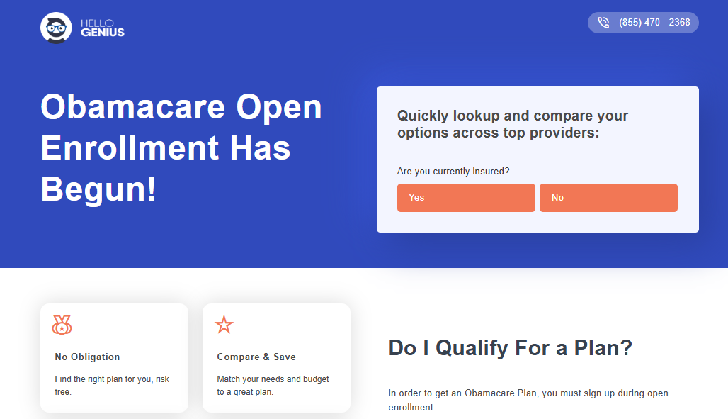 Hello Genius stands out by streamlining what is traditionally a complicated process. The platform is designed specifically for those seeking Obamacare plans, offering a one-stop solution for comparing quotes from top health insurance providers. The landing page immediately captures your attention with a clear call to action, inviting users to start with just a few simple steps. Whether you’re a first-timer or an experienced insurance shopper, Hello Genius offers a modern, accessible way to secure your health insurance needs.